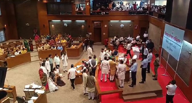 भोपाल। नगर निगम परिषद की बैठक में गुरुवार को जोरदार हंगामा हो गया। हाथापाई तक की नौबत आ गई। दरअसल भाजपा पार्षदों के बीच नवाब हमीदुल्लाह खान से जुड़े कई शहर के ऐतिहासिक स्थलों के नाम बदलने के प्रस्ताव पर बहस छिड़ गई। इस दौरान नगर निगम अध्यक्ष ने कहा कि भोपाल का नवाब गद्दार था, गद्दार है और गद्दार रहेगा। दोनों पक्षों के बीच जमकर नोंकझोंक हुई। ओल्ड अशोका गार्डन का नाम 'राम बाग' करने का प्रस्ताव पारित हो गया है। बैठक में पाकिस्तान मुर्दाबाद के नारे लगे। परिषद बैठक की शुरुआत सुबह करीब 11.30 बजे हुई। इसके बाद जैसे ही परिषद की कार्रवाई शुरु हुई। वार्ड क्रमांक 16 के पार्षद ने निगम में पंजीकृत संस्थाओं को दिए गए अनुदान के संबंध में जानकारी मांगी। इस मुद्दे को लेकर परिषद में पक्ष व विपक्ष दोनों तरफ से जमकर बहस हुई।