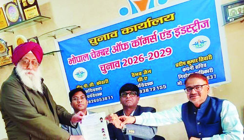 राजधानी के व्यापारियों की शीर्ष संस्था भोपाल चेंबर ऑफ कॉमर्स एंड इंडस्ट्रीज के चुनाव वर्ष 2026-29 के प्रथम चरण नामांकन फॉर्म भरने की प्रक्रिया के तहत 3 दिन में कुल 75 नामांकन पत्र प्राप्त हुए। जिसमें से अध्यक्ष पद के लिए 4, उपाध्यक्ष के लिए 9, महामंत्री के लिए 3, मंत्री के लिए 9, कोषाध्यक्ष के लिए, सह-कोषाध्यक्ष के लिए 3, अतिरिक्त-कोषाध्यक्ष के लिए 2 फॉर्म सहित 44 कार्यकारिणी पद के नामांकन जमा हुए।