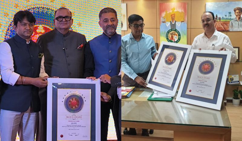 जीते गए स्कॉच अवॉर्ड 2025 को सहायक संचालक नागले ने मंडी बोर्ड एमडी और अपर प्रबंध संचालक को किया भेंट