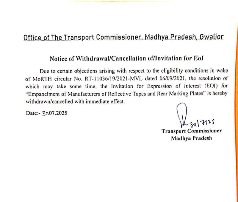 मप्र शासन ने समाप्त किया रिफ्लेक्टिव टेप (रेडियम पट्टी) पर प्रस्तावित मोनोपॉली व्यवस्था को