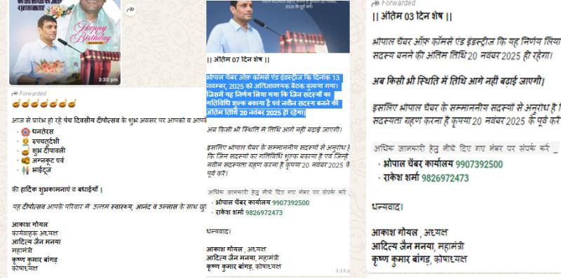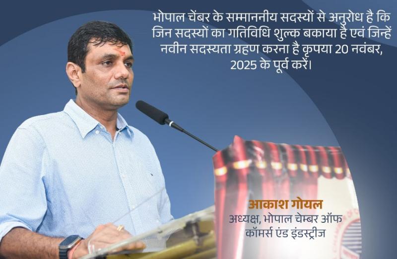 राजधानी भोपाल के व्यापारियों की संस्था भोपाल चेंबर ऑफ कॉमर्स एंड इंडस्टीज में राजनीतिक हस्तक्षेप से की बदौलत अब पदनाम का अनाधिकृत दुरूपयोग हो रहा है क्योंकि चेंबर के कार्यवाहक अध्यक्ष स्वयंभू अध्यक्ष बन गए हैं। जिसकी पुष्टि उनके द्वारा सोशल मीडिया (वॉट्सएप) भेजे जाने वालें संदेश में आकाश गोयल अध्यक्ष, भोपाल चेंबर ऑफ कॉमर्स एंड इंडस्ट्रीज से होती है।