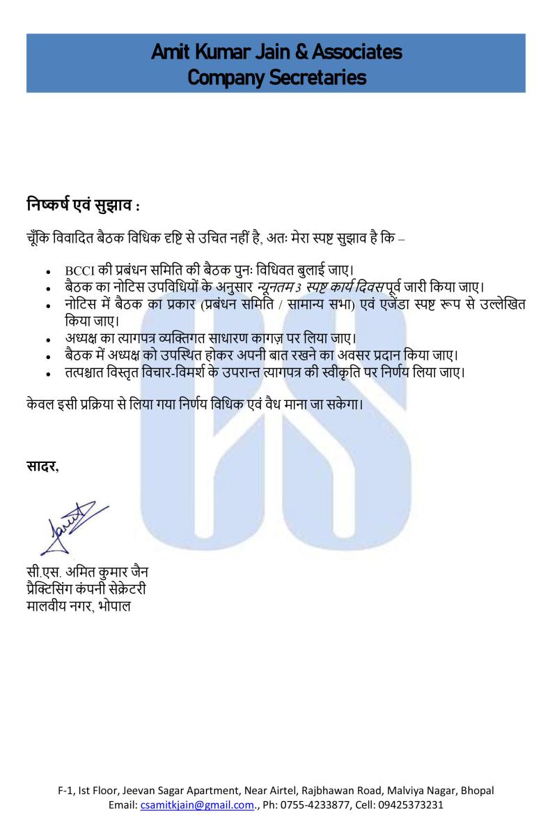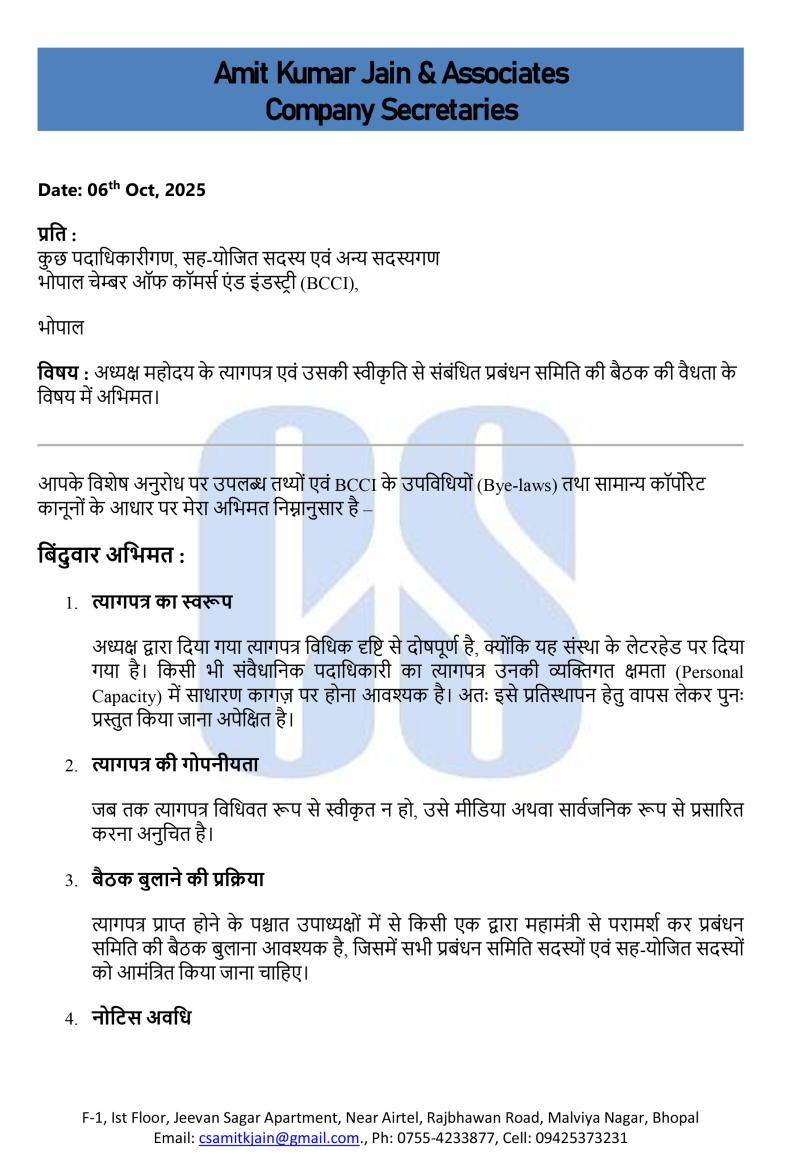 भोपाल चेंबर ऑफ कॉमर्स एंड इंडस्ट्रीज में तेजकुल पाल सिंह पाली के द्वारा अध्यक्ष पर से दिए गए इस्तीफे को लेकर और चैंबर कार्यालय में घटित हुई घटना पर एसोसिएट कंपनी सेक्रेटरी सीएस अमित कुमार जैन ने स्पष्ट किया कि अध्यक्ष तेजकुल पाल सिंह पाली का त्यागपत्र दृष्टि से दोषपूर्ण है, क्योंकि यह संस्था के लेटर हेड में दिया गया है। किसी भी संवैधानिक पदाधिकारी का त्यागपत्र उनकी व्यक्तिगत क्षमता में साधारण कागज पर होना आवश्यक है। अत: इसे प्रतिस्थापन के लिए वापस लेकर पुन: प्रस्तुत किया जाना अपेक्षित है।