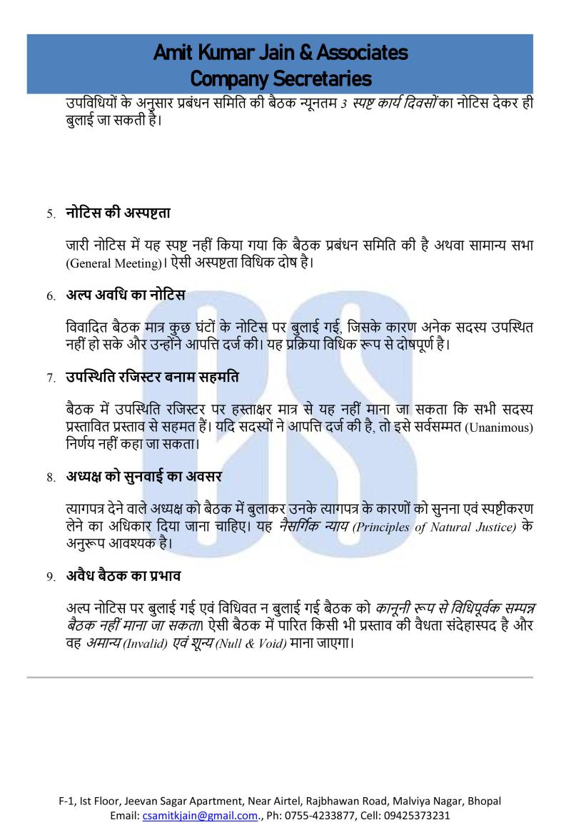 इसके अलावा कंपनी सेक्रेट्री सीएस अमित कुमार जैन ने यह भी स्पष्ट किया कि भोपाल चेंबर ऑफ कॉमर्स के महामंत्री द्वारा जो भी प्रक्रिया अपनाई गई वह पूर्णत: असंवैधानिक और दोषपूर्ण है। उन्होंने कहा कि अल्प नोटिस पर बुलाई गई एवं विधिवत न बुलाई गई बैठक को कानूनी रूप से विधिपूर्ण संपन्न बैठक नहीं माना जा सकता है। ऐसी बैठक में परित किसी भी प्रस्ताव को वैधता प्रदान नहीं की जा सकती। वह अमान्य एवं शून्य माना जाएगा।