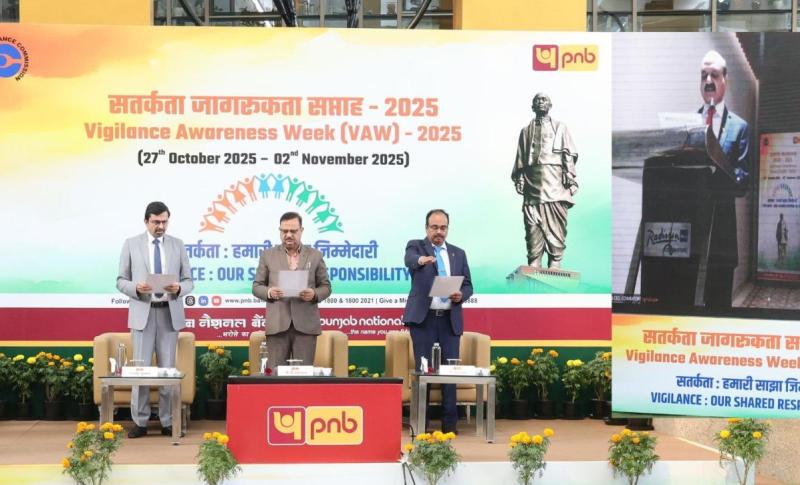 पंजाब नेशनल बैंक ने अपने कॉर्पोरेट कार्यालय में सतर्कता जागरुकता सप्ताह-2025 का शुभारंभ किया। जहां प्रबंध निदेशक एवं मुख्य कार्यपालक अधिकारी अशोक चंद्र तथा मुख्य सतर्कता अधिकारी राघवेंद्र कुमार ने स्टाफ सदस्यों को सत्यनिष्ठा की शपथ दिलाई साथ ही पारदर्शिता, जवाबदेही एवं नैतिक शासन के प्रति बैंक की अटूट प्रतिबद्धता की भी पुष्टि की।
