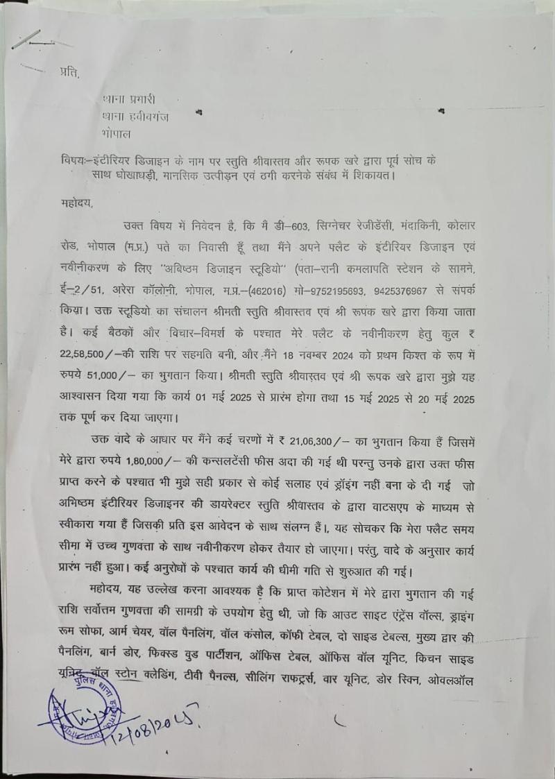 पीडित सन्नी छावड़ा द्वारा संलग्न दस्तावेज के साथ जो आवेदन दिया है उसमें उल्लेख है कि मैं डी-603, सिग्नेचर रेजीडेंसी, मंदाकिनी, कोलार रोड, भोपाल (म.प्र.) पते का निवासी हूं तथा मैंने अपने फ्लैट के इंटीरियर डिजाइन एवं नवीनीकरण के लिए "अबिष्ठम डिजाइन स्टूडियो" (पता-रानी कमलापति स्टेशन के सामने, ई-2/51, अरेरा कॉलोनी, भोपाल, म.प्र.- (462016) मो-9752195693, 9425376967 से संपर्क किया। उक्त स्टूडियो का संचालन श्रीमती स्तुति श्रीवास्तव एवं श्री रूपक खरे द्वारा किया जाता है। कई बैठकों और विचार-विमर्श के पश्चात मेरे फ्लैट के नवीनीकरण हेतु कुलर 22,58,500/- की राशि पर सहमति बनी और मैंने 18 नवम्बर 2024 को प्रथम किश्त के रूप में रुपए 51,000/- का भुगतान किया। श्रीमती स्तुति श्रीवास्तव एवं रूपक खरे द्वारा मुझे यह आश्वासन दिया गया कि कार्य 01 मई 2025 से प्रारंभ होगा तथा 15 मई 2025 से 20 मई 2025 तके पूर्ण कर दिया जाएगा। उक्त वादे के आधार पर मैंने कई चरणों में 21,06,300/- का भुगतान किया हैं जिसमें मेरे द्वारा रुपये 1,80,000/- की कन्सलटेंसी फीस अदा की गई थी परन्तु उनके द्वारा उक्त फीस प्राप्त करने के पश्चात भी मुझे सही प्रकार से कोई सलाह एवं ड्रॉइंग नहीं बना के दी गई जो अभिष्ठम इंटीरियर डिजाइनर की डायरेक्टर स्तुति श्रीवास्तव के द्वारा वाटसएप के माध्यम से स्वीकारा गया हैं जिसकी प्रति इस आवेदन के साथ संलग्न हैं। यह सोचकर कि मेरा फ्लैट समय सीमा में उच्च गुणवत्ता के साथ नवीनीकरण होकर तैयार हो जाएगा। परंतु, वादे के अनुसार कार्य प्रारंभ नहीं हुआ। कई अनुरोधों के पश्चात कार्य की धीमी गति से शुरुआत की गई।