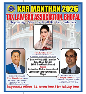 कर सलाहकारों की संस्था टैक्स लॉ बार एसोसिएशन के अध्यक्ष मृदुल आर्य ने बताया कि 7 फरवरी को कुशाभाऊ ठाकरे अंतरराष्ट्रीय सभागृह में एकदिवसीय कर सम्मेलन कर मथंन 2026 का आयोजन किया जा रहा है।