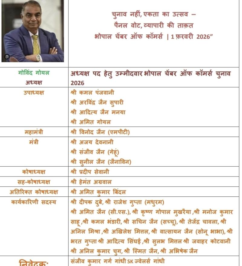 राजधानी के 70 से अधिक व्यापारिक संगठनों के व्यापारियों की शीर्ष संस्था भोपाल चेंबर ऑफ कॉमर्स एंड इंडस्ट्रीज (बीसीसीआई) के त्रैवासिक (2026-2029) चुनाव के लिए मतदान 1 फरवरी 2026 को मानस भवन, पॉलिटेक्निक चौराहा, श्यामला हिल्स में सुबह 8 बजे से शुरू होगा। चुनाव के दूसरे चरण यानि नामांकन वापसी के बाद उम्मीदवारों को मतपत्र क्रमांक मिलने के बाद शहर के व्यापारिक जगत में चुनाव की गहमागमी बढ़ गई है।