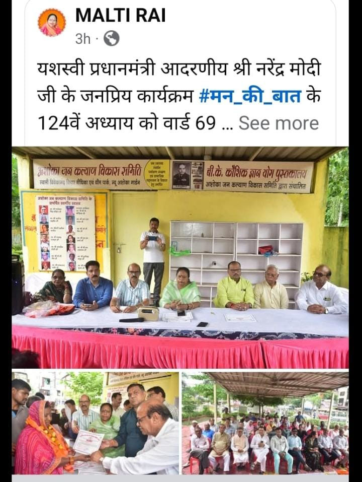 भोपाल । स्वच्छता और जनभागीदारी के संगम का अनूठा दृश्य विवेकानंद विचार वीथिका पार्क में देखने को मिला, जब अशोका जन कल्याण विकास समिति द्वारा आयोजित विशेष कार्यक्रम में महापौर मालती राय और पार्षदों ने स्थानीय सफाई कर्मियों संग प्रधानमंत्री नरेंद्र मोदी की ‘मन की बात’ सुनी और उनके कार्यों की सराहना की। साथ ही समिति के अध्यक्ष ठाकुर लाल राजपूत ने स्वच्छता के नायकों का सम्मान किया।