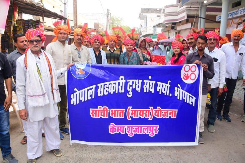 एमपी स्टेट कोआपरेटिव डेयरी फेडरेशन लिमिटेड (एमपीसीडीएफ) से संबद्ध भोपाल सहकारी दुग्ध संघ द्वारा चलाई गई सांची भात (मायरा) योजना के अंतर्गत बुधवार 26 नवम्बर 2025 को राष्ट्रीय दुग्ध दिवस पर भोपाल सहकारी दुग्ध संघ अंतर्गत जिला शाजापुर कैम्प शुजालपुर की महिला दुग्ध सहकारी समिति नयापुरा नांदनी में समिति की सदस्य श्रीमती कृष्णा बाईं राजपूत की सुपुत्री पूजा राजपूत की शादी समारोह मे सांची परिवार ने सांची मायरा सौंपा है। सौंपे गए थाल में 11-11 हजार रूपए नगद, उपहार रूवरूप साड़ियां, कपड़े, सांची गिफ्ट पेक, फल-श्रीफल व मिठाईयां शामिल है।