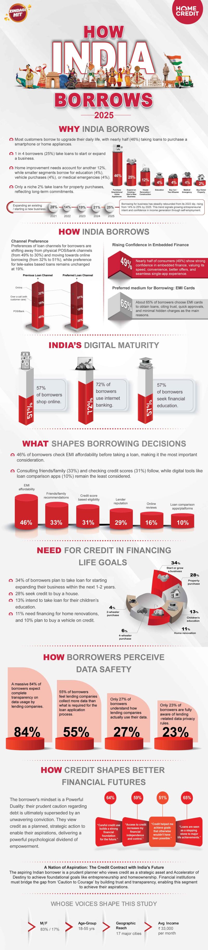 होम क्रेडिट इंडिया के चीफ मार्केटिंग आफीसर आशीष तिवारी कहते हैं, "हाउ इंडिया बोरोज़ 7.0 अध्ययन भारत की क्रेडिट संस्कृति में एक बदलाव को दर्शाता है - जीवित रहने के लिए उधार लेने से लेकर सफलता के लिए उधार लेने तक।" "जेन ज़ी, मिलेनियल्स, महिलाएं और छोटे शहर डिजिटल ऋण क्रांति का नेतृत्व कर रहे हैं, जो गति, सरलता और निजीकरण को महत्व देते हैं। एम्बेडेड फाइनेंस दिक्कत-रहित ऋण को संचालित कर रहा है, जहां विश्वास, प्रौद्योगिकी और मूल्य अभिसरण होकर भारत के ऋण लेने के तरीके को फिर से परिभाषित कर रहे हैं। निम्न-मध्यम वर्ग अपनी महत्वाकांक्षाओं में तेजी से रणनीतिक हो रहा है, क्रेडिट का उपयोग उद्यमशीलता, घर के स्वामित्व और शिक्षा के लिए एक सेतु के रूप में कर रहा है। होम क्रेडिट इंडिया में, हम उन्हें विवेकपूर्ण योजनाकार और आत्मविश्वासी निर्माता के रूप में देखते हैं। हम अपने ग्राहकों को एक पारदर्शी वित्तीय यात्रा के साथ सशक्त बनाने के लिए प्रतिबद्ध हैं जो व्यक्तिगत प्रगति, राष्ट्रीय विकास और वित्तीय समावेशन को बढ़ावा देती है, जिससे हर उधारकर्ता की # जिंदगी हिट होती है।"