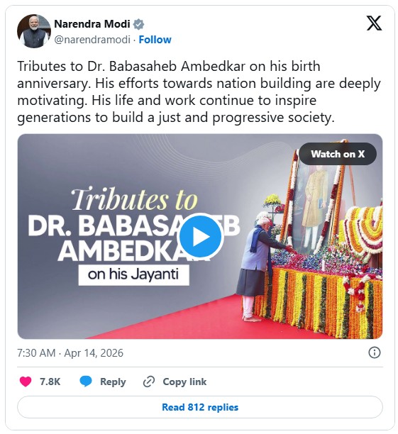 डॉ. बाबासाहेब आंबेडकर की जयंती पर उन्हें विनम्र श्रद्धांजलि। राष्ट्र निर्माण की दिशा में उनके प्रयास अत्यंत प्रेरणादायी हैं। उनका जीवन और कार्य, एक न्यायपूर्ण और प्रगतिशील समाज के निर्माण के लिए पीढ़ियों को निरंतर प्रेरित करता रहेगा।